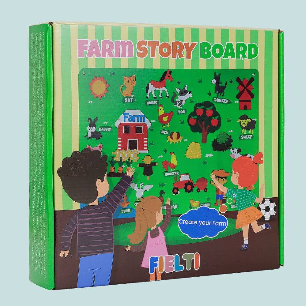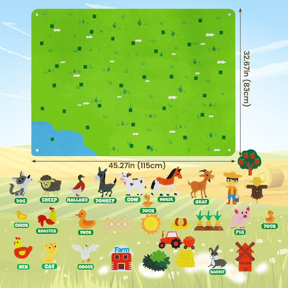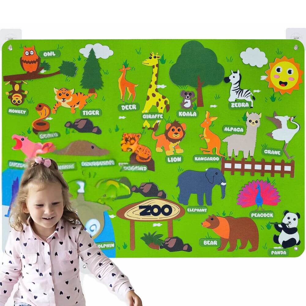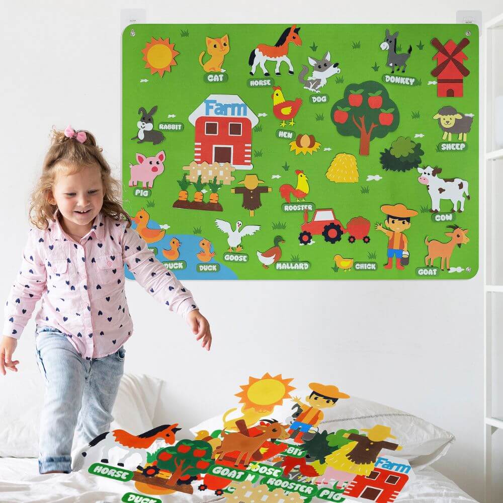 Inspirado en el método Montessori, este set de fieltro ayuda a los niños a desarrollar su motricidad fina, la creatividad y a aprender inglés de forma natural y divertida.